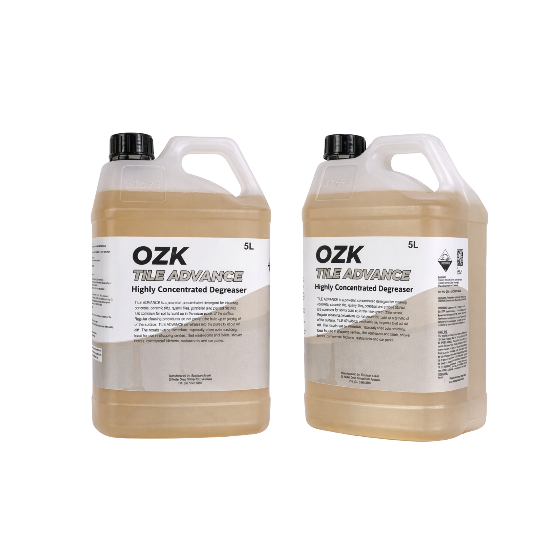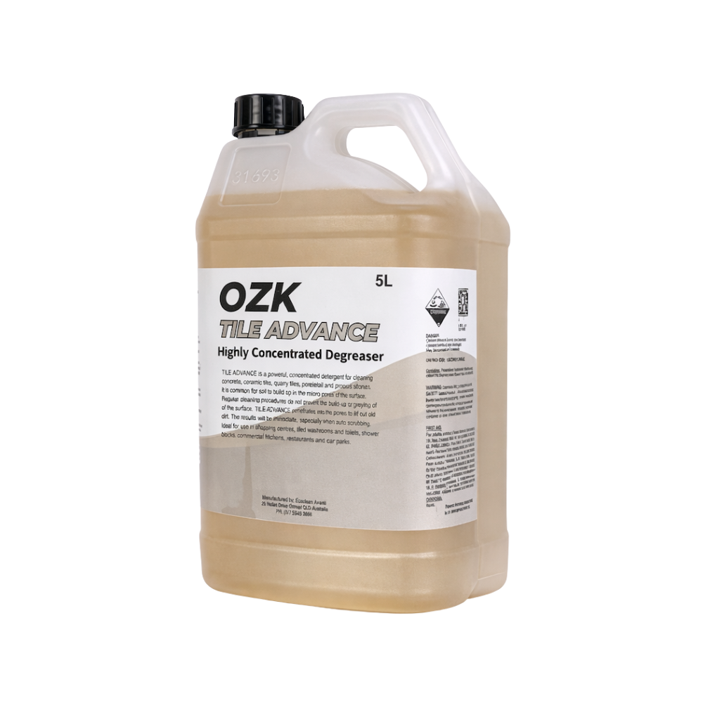 OZK Tile Advance is a highly concentrated, heavy-duty alkaline degreaser designed for extreme cleaning conditions where standard cleaners fail. It rapidly penetrates and emulsifies heavy grease, oil, soap scum and carbon build-up.